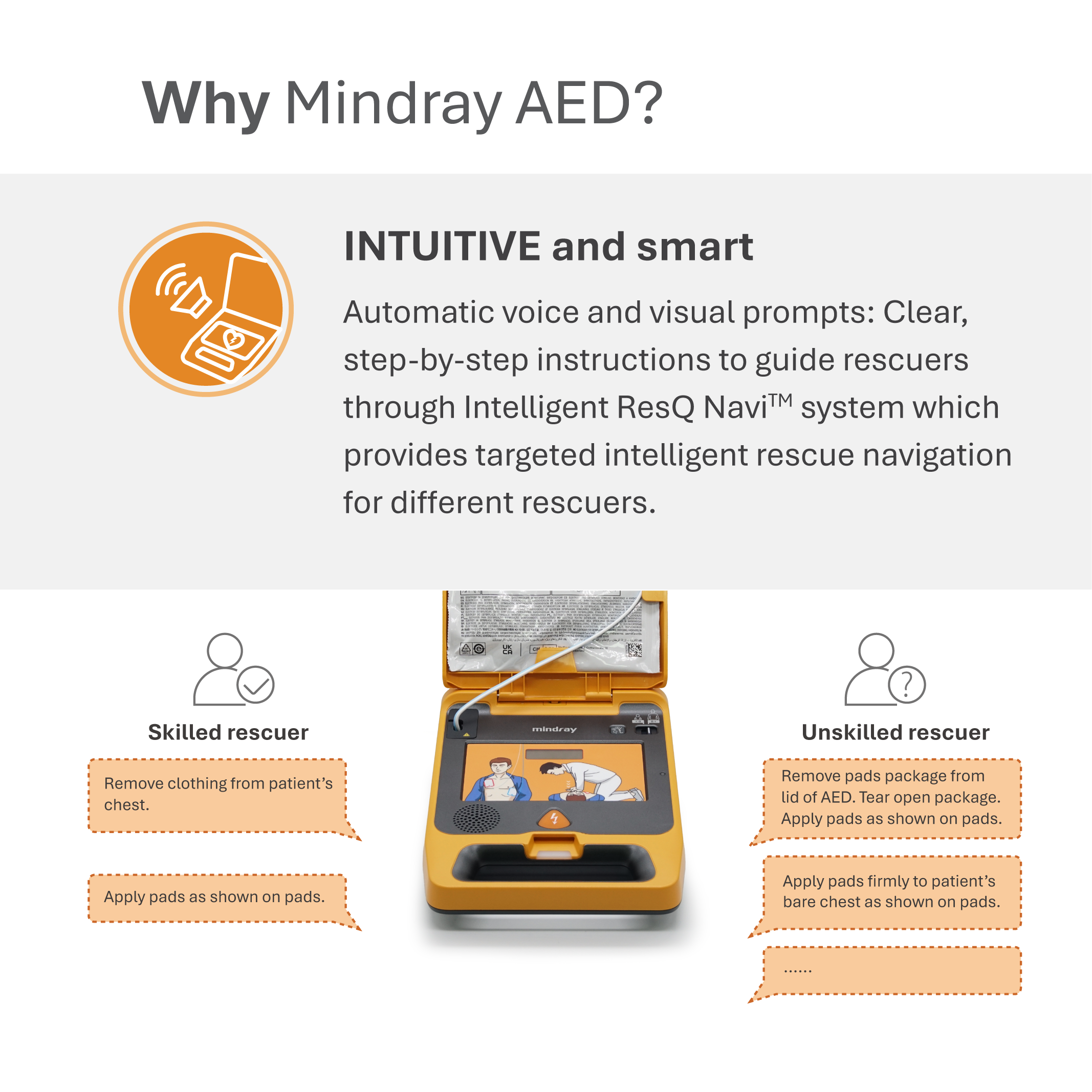 With the ResQNavi™, it is able to recognize the challenge of the responder encounters in time, and provide more detailed operation guidance for the responder through the change of voice prompts.