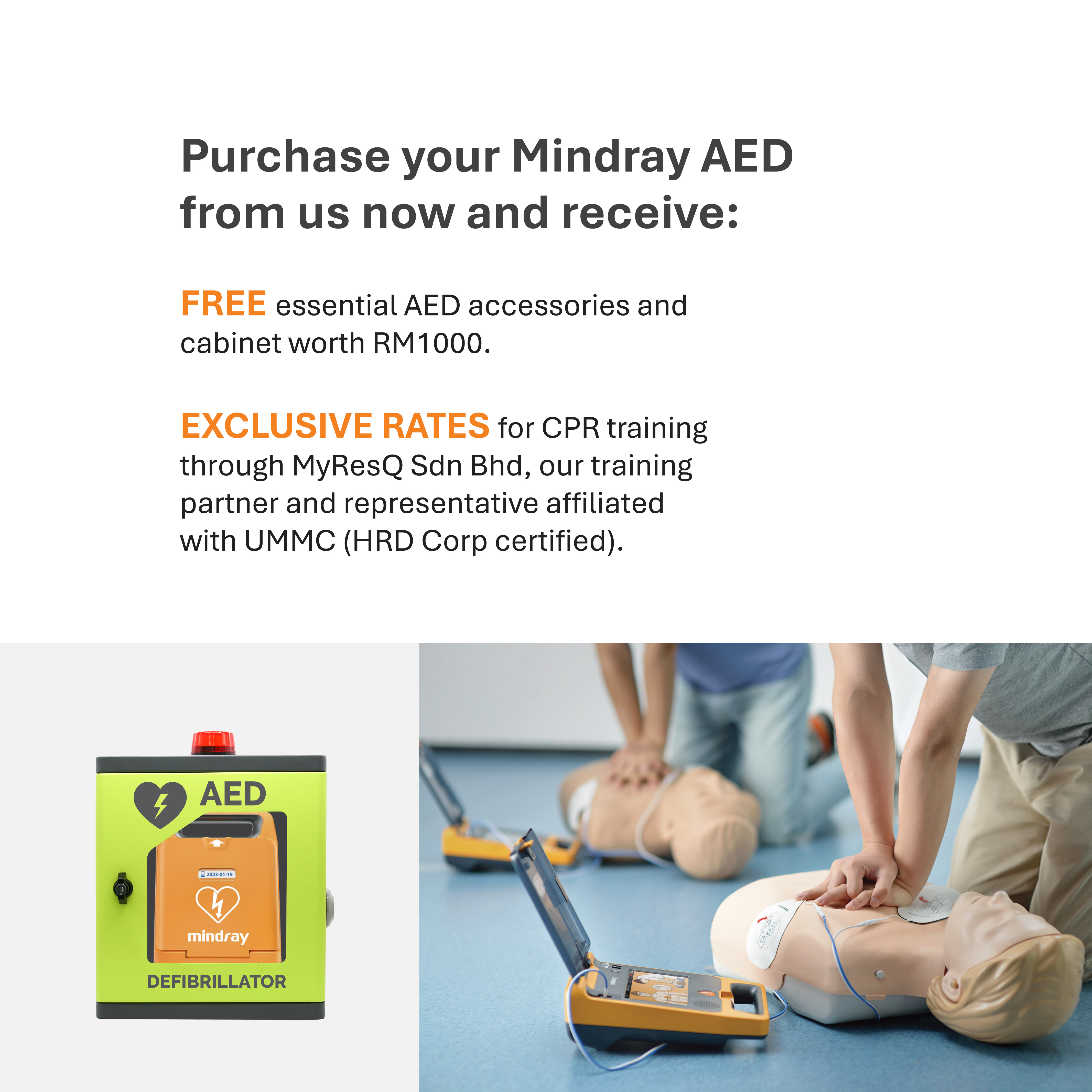 We provide exclusive rates for Cardiopulmonary Resuscitation (CPR) and First Aid Training by collaborating with MyResQ Sdn Bhd (MyResQ) which is affiliated to UMMC, to act as our training partner and representative.