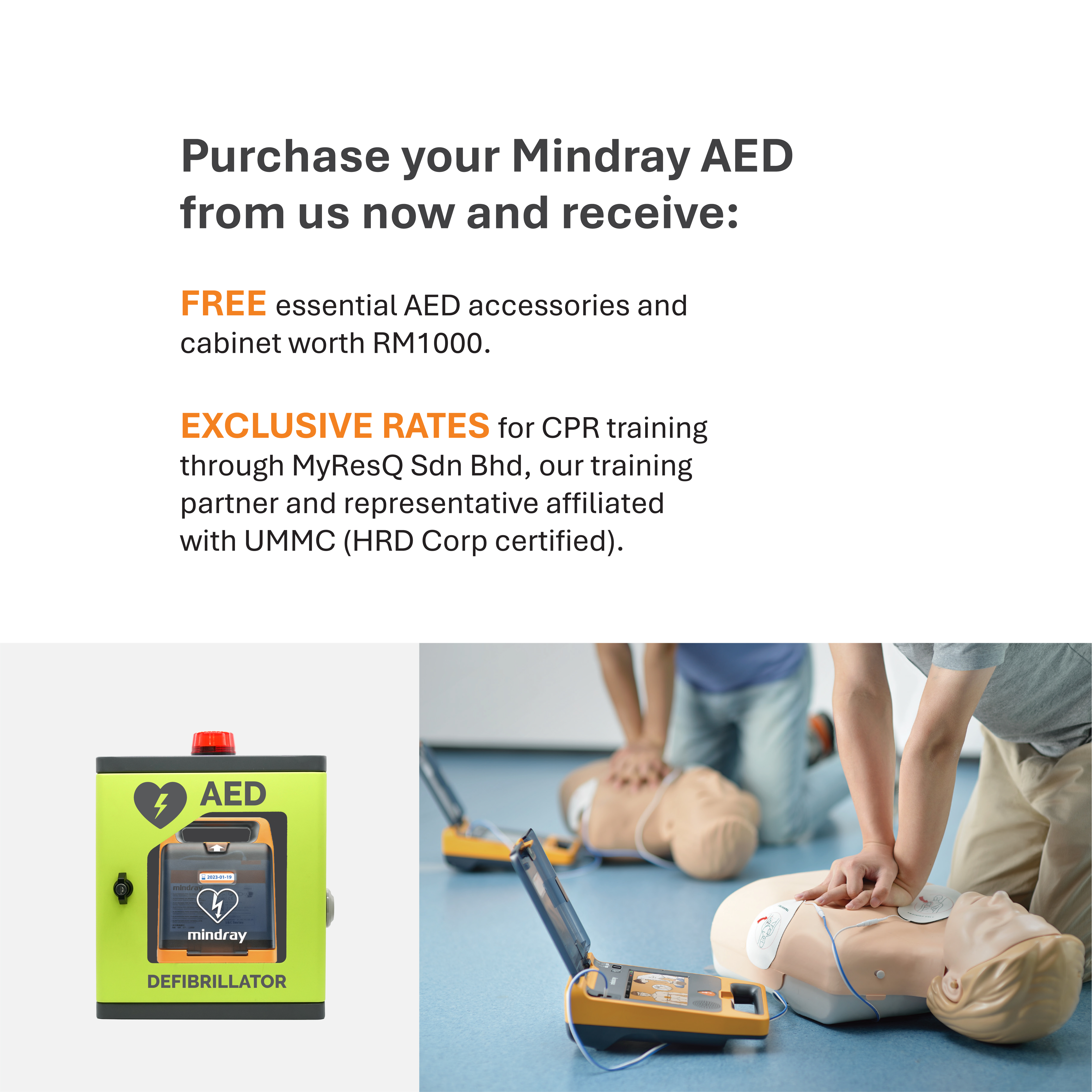 We provide exclusive rates for Cardiopulmonary Resuscitation (CPR) and First Aid Training by collaborating with MyResQ Sdn Bhd (MyResQ) which is affiliated to UMMC, to act as our training partner and representative.