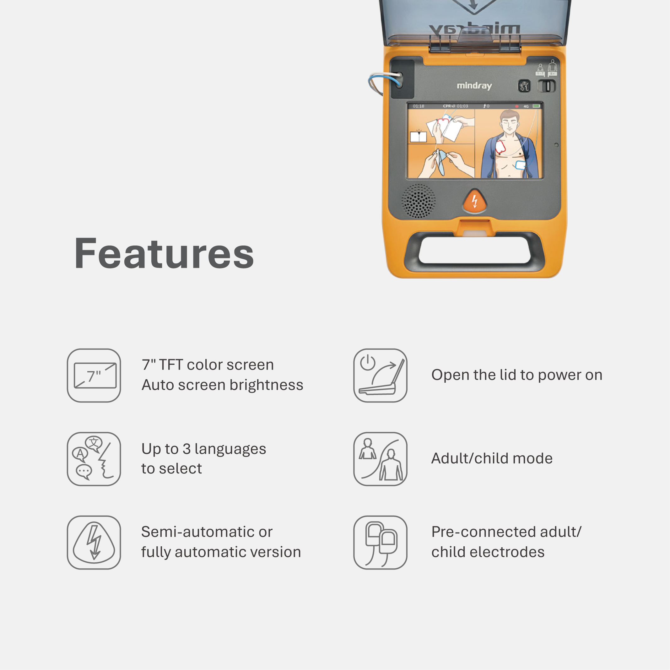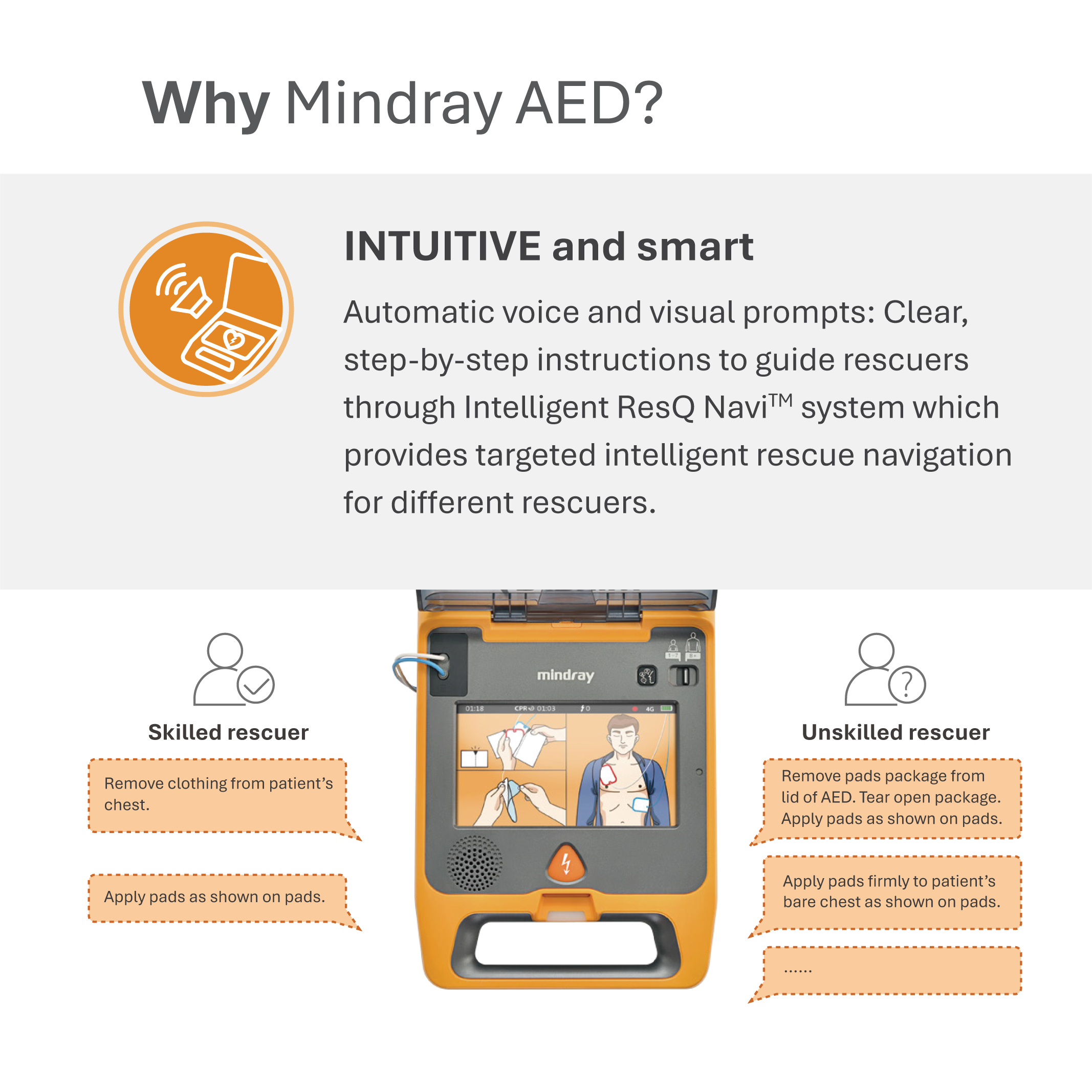 Mindray's BeneHeart C series AED provides a solution for responders with or without medical backgrounds to respond promptly to out-of-hospital SCAs. With the ResQNavi™, it is able to recognize the challenge of the responder encounters in time, and provide more detailed operation guidance for the responder through the change of both animation and voice prompts.